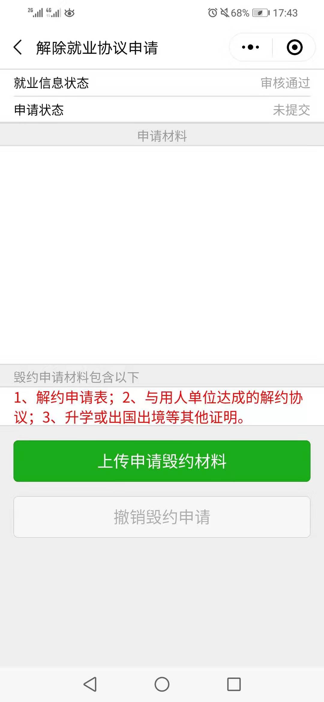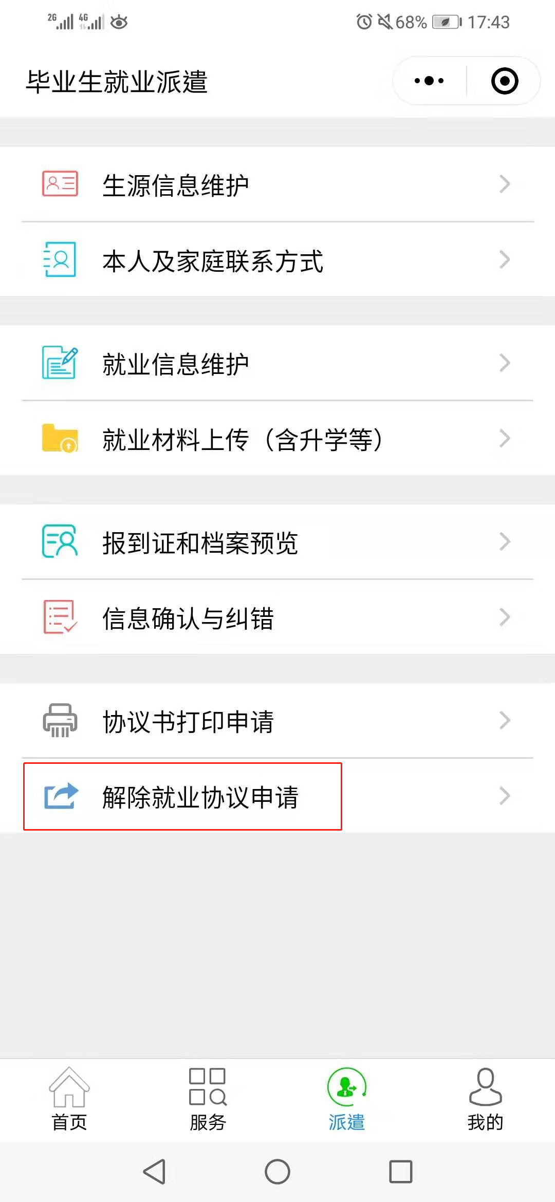 第一步、毕业生进入微信小程序:安徽省大学生就业服务平台,点击“派遣”,进入“解除就业协议申请”,上传解约申请材料。
