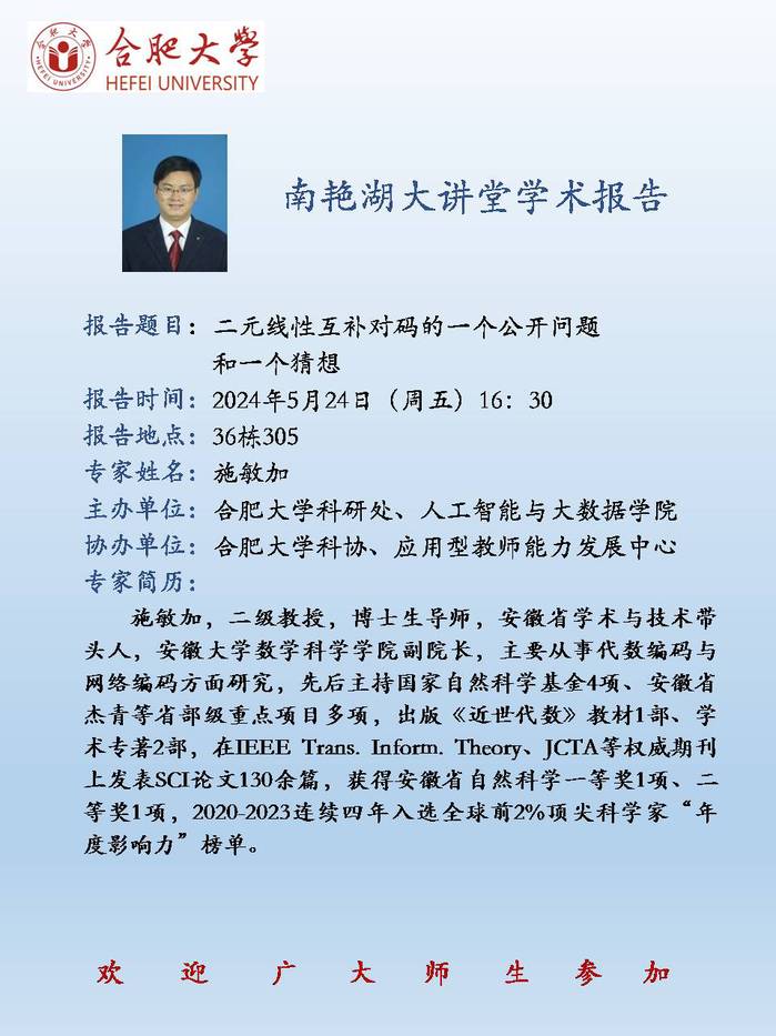 【南艳湖大讲堂】二元线性互补对码的一个公开问题和一个猜想