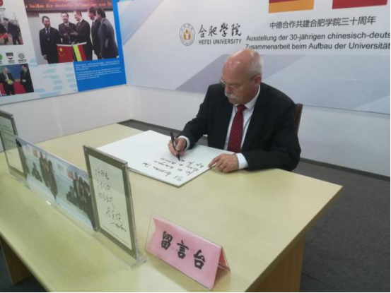 The two parties visit HFU’s Sino-German Cooperation Achievement Exhibition. Chair Cai states that HFU is a local undergraduate university born in the Reform, growing in the Opening-up and developing in innovation, which has proposed its school-running orientation of “locality, application and internationalization” ever since 2003. Learning from the German universities of applied sciences, HFU not only promotes its own development, but also plays a leading role in the transformation and development among domestic local universities.