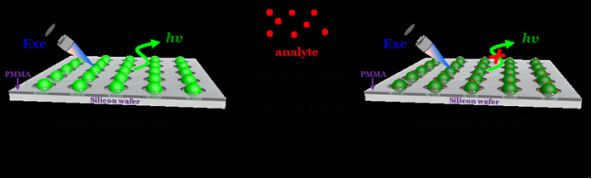 In this paper, it is mentioned that the synthesized SiO2@MIPs forms a microsensor array on the regular dot array of etched silicon wafers by self-assembled technique, and four heavy metal ions, whose LOD concentration is 10−9 mol·L−1, enter the nanostructured shell-layer with fluorescence-tagged recognition site driven by concentration differences. The recognition sites have highly selective recognition of heavy metal ions with sensitive responses. Based on FRET principle, ultra-trace detection of the target analytes can be achieved, which solves the problem of identification and detection of polymetallic ions.