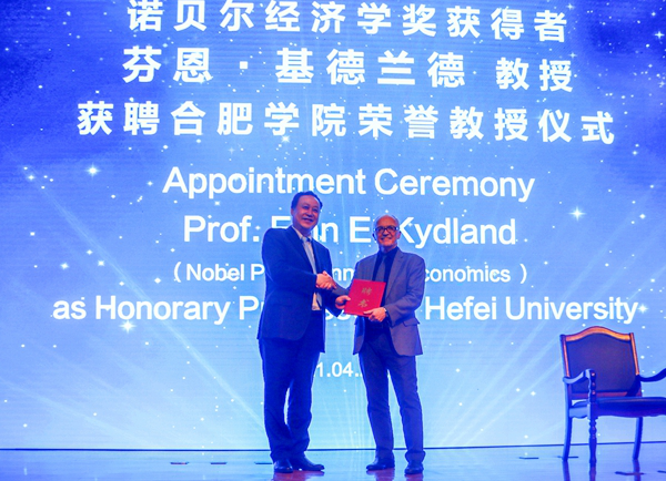 On April 21st, FinnE.Kydland, the Nobel Economics Prize Winner(2004) visits HFU and gives a lecture on “The way to the Nobel Prize”. Finn E.Kydland, a Norwegian economist, won the Nobel Prize together with Edward Prescott in 2004 for his accomplishments in dynamic macro-economics. Currently, he is a professor at Carnegie-Mellon University and the University of California(Santa Barbara), and an associate researcher at the Duras and the Cleveland Reserve Bank. His research mainly focuses on business cycling term, currency, fiscal policy and labor economics. Dr. Cai Jingmin, Chair of HFU Council, and Dr. Wang Qidong,president of HFU entitled him “HFU Honorary Professor”. Professor Kydland says the distinctive characteristics and development potential of HFU impresses him much and he expects to cooperate with HFU in the future. After the lecture, Professor Kydland exchanged opinions with HFU teachers especially on economics. | | |