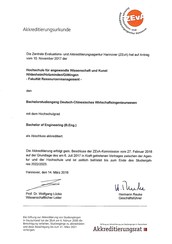 2018年3月14日,德国中央评估与认证机构向我校中德经济工程专业颁发了德国认证证书。据了解,此次认证是安徽省高校中外合作专业第一个通过德国认证,这也是合肥学院与希尔德斯海姆/霍尔茨明登/哥廷根应用科学大学近10年积极合作的成果。我校将以此为契机,进一步深化中德经济工程专业合作与发展,并支撑经济工程新专业建设,为中德合作的进一步发展贡献力量。