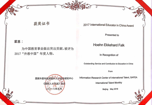特别值得一提的是,2017“外教中国”年度人物评选出了一批优秀的外国文教专家。在典礼现场,我们通过故事讲述人、中央人民广播电台十佳主持人马宗武的倾情讲述,了解到他们许多感人至深的故事。我校的副院长、2014年中国政府友谊奖获得者霍恩教授获得了此奖项,并由他的的女儿霍泰莎来到清华大学代替他领奖发言,她发言时说道他父亲小时候拍的一张让它她父亲至今难忘的照片,那是他父亲十几年前在合肥市黄山路与金寨路交口拍的一张照片,偌大的路口只有一两辆汽车,如今这里车水马龙,而且还建了高架桥。他父亲说这只是合肥乃至安徽近年来快速发展、活力迸发、开放创新的一个缩影。获得此奖项的还有来自意大利的布鲁诺·布里斯杰拉,现任福州大学土木工程国际化示范学院外籍院长,也是2013年中国政府友谊奖获得者外专项目专家,大连枫叶国际学校加方课程教师凯丽·特丽萨·克雷默,西北工业大学教授、美国国家工程院院士、曾两次获得诺贝尔奖提名的克日什托夫·马蒂亚谢夫斯基,中国工程院外籍院士、郑州大学医学科学院院长尼古拉斯·罗伯特·莱蒙,北京大学教授约翰·扎卡赖亚斯,电子科技大学教授孟睿思,北京外国语大学客座教授、知名汉学家沃尔夫冈·顾彬,中国人民大学教授、美国科学与社会学院院士唐纳德·沃斯特,四川外国语大学阿拉伯语语言文学教授赛勒玛·伊布拉欣等。