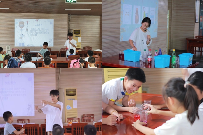 活动中,志愿者们让小朋友自主参与科学实验,探究实验原理,在动手的过程中体验科学的奥秘与乐趣,营造崇尚科学、推动创新的良好氛围。实验课上,志愿者通过“自制简易净水器”,让小朋友们理解水净化的基本原理,掌握简单的净水技术;“紫甘蓝变色”实验将紫甘蓝水放入不同溶液中,观察紫甘蓝水变色的现象;“水的浮力”课程中,飘在水上的回形针揭示了水的张力内在原理,引发了小朋友们对实验和科学的好奇心与兴趣。一系列实验,让小朋友们连连称赞,教室里一片欢声笑语。