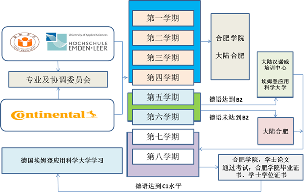 在教育主管部门的大力支持下,基于合肥学院中德合作共建多年的基础,依托中德教育合作示范基地及我校多年的办学实力,结合德国“双元制”高等教育领域的新探索,与德国大陆集团、埃姆登/里尔应用科学大学由安徽省人民政府代表团访德期间正式签约(图1),设置了机械设计制造及其自动化(双元制)专业--以下简称“大陆班”。