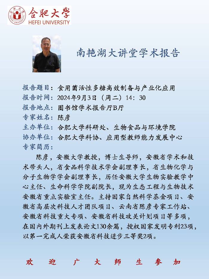 【南艳湖大讲堂】食用菌活性多糖高效制备与产业化应用