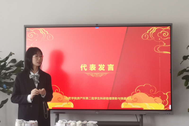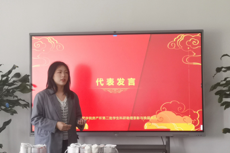 427日举行合肥学院房地产研究所第二批学生科研助理表彰暨第三批换届典礼,介绍房产所以及学生科研助理所应该具备的品质、主要工作以及考核制度,对优秀科研助理进行颁奖并请优秀学生代表发言,以及对新一批的科研助理颁发聘书。