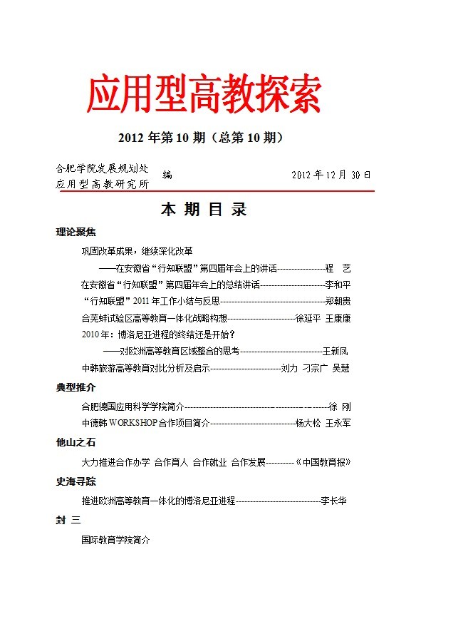 应用型高教探索10 期以区域高校合作与国际高校合作为主题组稿,这也是2012年最后一期,目录如下,具体内容请查阅发展规划处网站(http://www.hfuu.nbdazhong.com/s/85/t/330/p/1/c/4437/list.htm)。