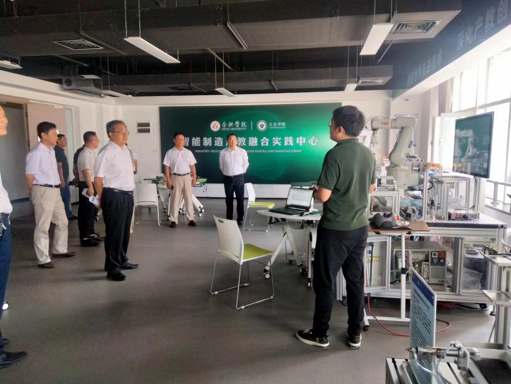 汪恭文一行参观了53号楼安徽省现代电子控制与检测应用技术协同创新中心、7号楼大众学院智能制造产教融合实践中心,听取实验室负责人关于项目情况、实验设备、应用型人才培养等情况的汇报,深入了解学校教学、科研及产教融合项目建设情况。