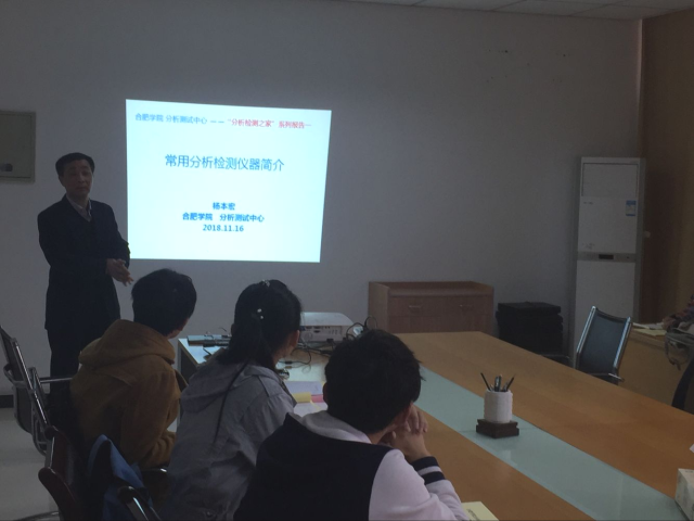 第一次理论培训由中心主任杨本宏讲授亲自主讲,他通过PPT首先简要概述了分析检测的重要性,然后详细介绍常用分析检测仪器的用途和应用领域,并结合本中心现有大型仪器进行了具体的讲解。主要内容包括:成分分析、元素分析、化学结构分析、物相、形貌分析、热性能分析以及力性能分析。培训结束后,同学们根据所学专业以及个人兴趣,填写、提交了仪器设备选择的意向表,中心将根据学员的选择,将他们定向分配到相应的指导老师名下,进行具体的仪器使用培训。