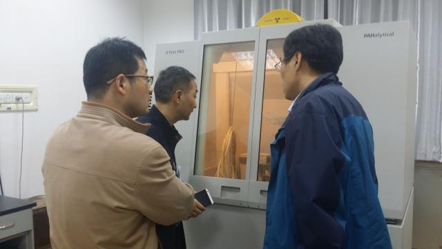 调研过程中,杨主任一行主要参观了扫描电镜室、透射电镜室、X射线衍射实验室以及样品预处理实验室,并对仪器设备购置、仪器使用率、仪器的维保、仪器的价格等问题与吴兵主任进行交流。参观结束后,杨本宏主任与吴主任进行实验室管理方面的交流,对如何对实验人员进行考核、调动工作人员的积极性、提升实验人员的测试水平、强化考勤管理、仪器设备合理使用等,吴主任都毫无保留地回答、探讨,气氛非常融洽。
