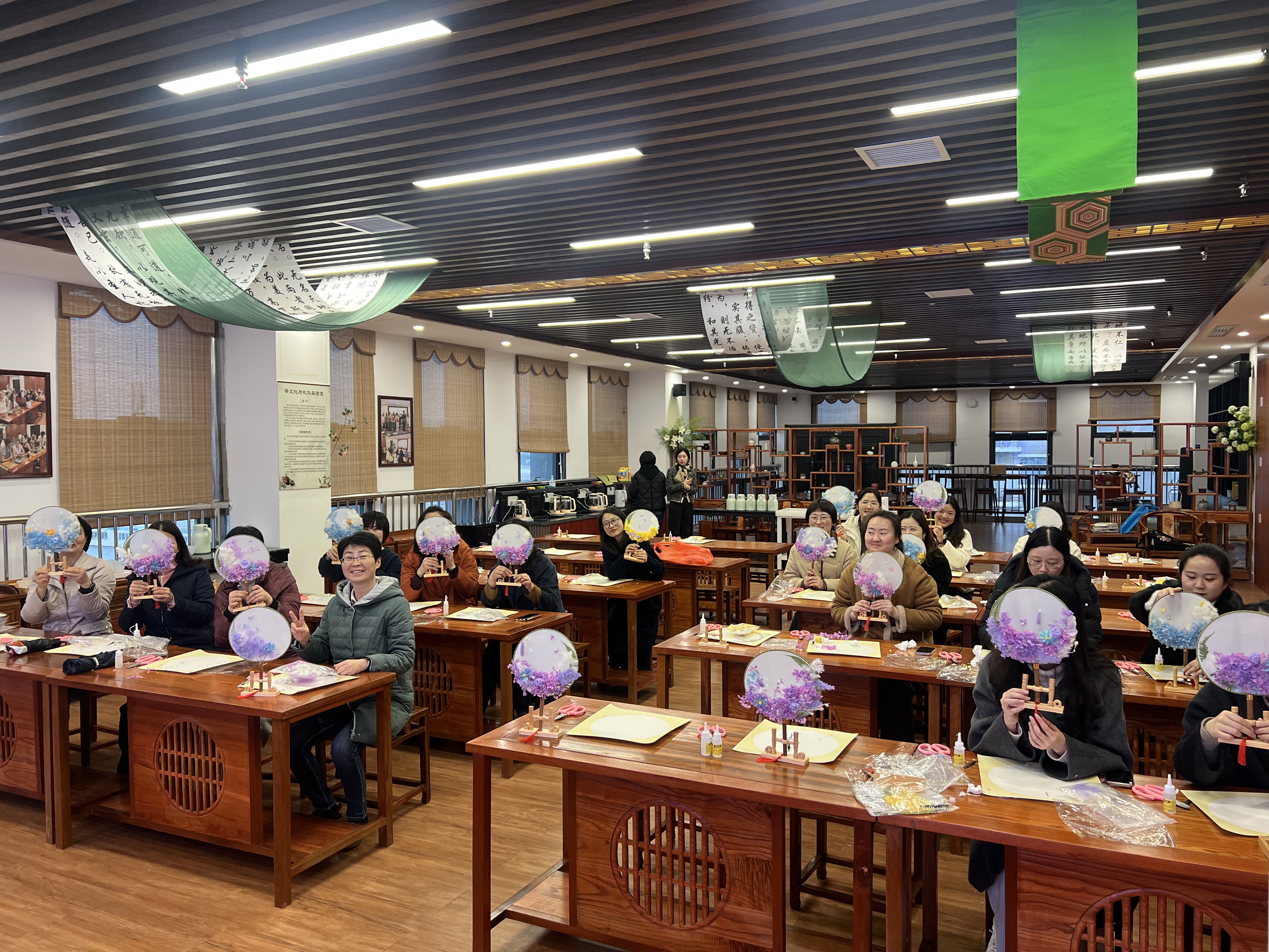 活动从场精彩纷呈的团扇知识科普讲座开始,授课老师以生动专业的讲解方式,深入浅出地介绍了团扇的悠久历史文化、精湛制作工艺以及实用技巧。大家在老师的讲解中,对这一传统工艺品有了更为深入的认识和理解。随后,老师亲自进行制作示范,从扇面的创意设计、色彩的巧妙搭配,到永生花和装饰的精细粘贴技巧,每一个步骤都讲解得细致入微,让大家对团扇制作有了更直观的感受。