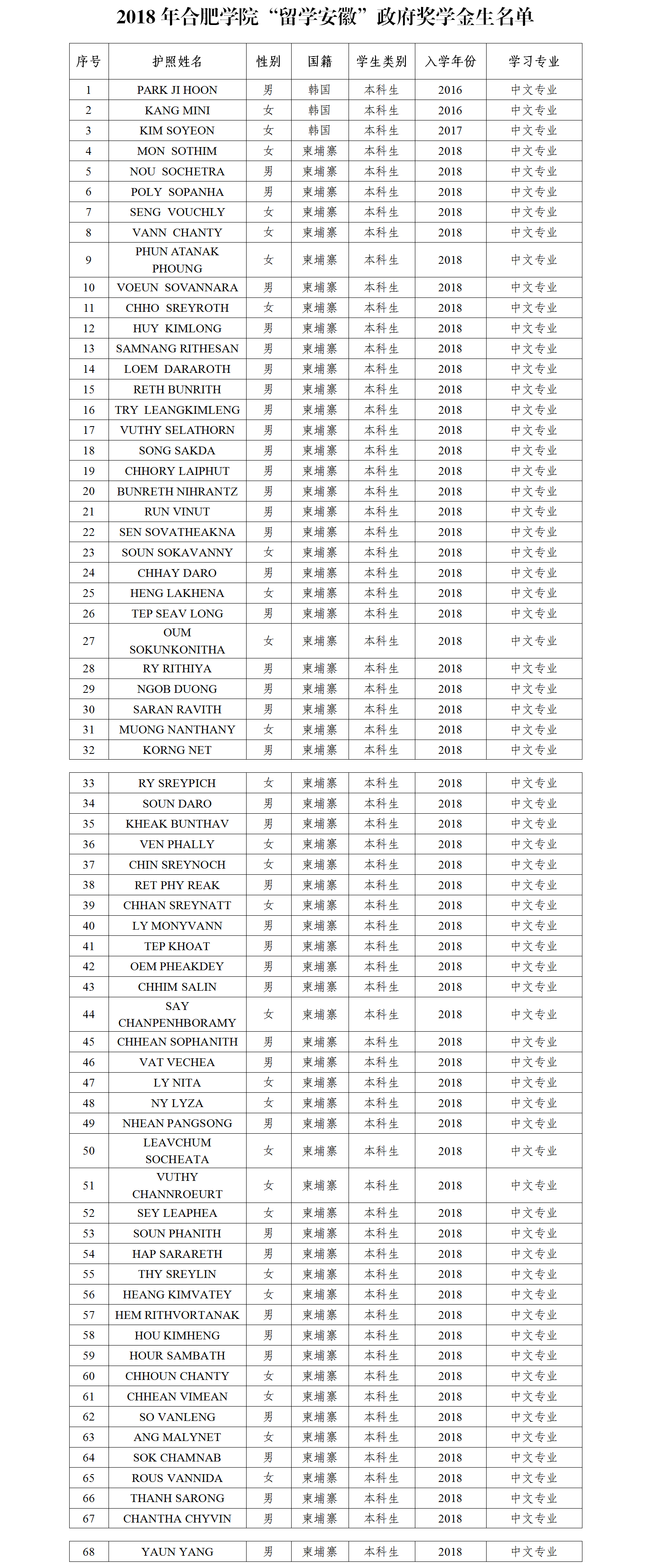 合肥学院关于PARK JI HOON等68名在读国际学生获2018年“留学安徽”政府奖学金的公示