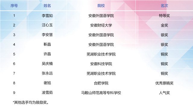 根据安徽省教育厅办公室皖教办函〔2022〕127 号《关于举办“第十五届安徽省顺天乡杯韩国语演讲大赛”的通知》安排,依据赛前公布的比赛规则,经大赛组委会选拔评比,现将大赛结果相关事宜通知如下: