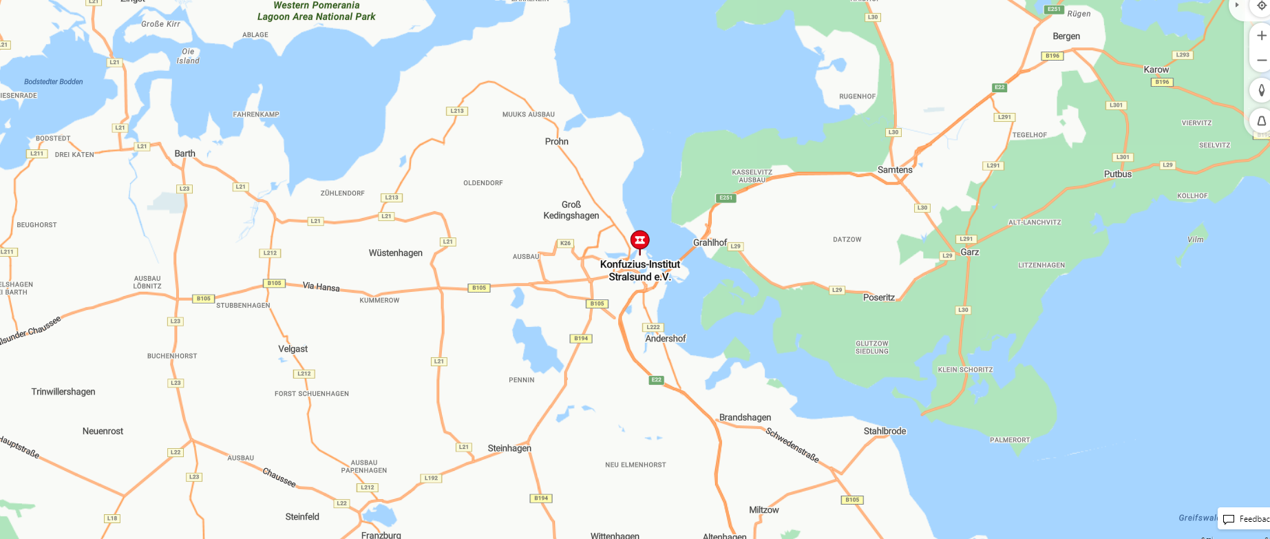 Am 30. August 2019 schrieb Angela Merkel eine Grußbotschaft an das Konfuzius-Instituts Stralsund mit den Worten: Das Konfuzius-Instituts Stralsund bietet ein breites Spektrum von Kursangeboten und kulturellen Aktivitäten für interessierte Menschen aus dem lokalen Umfeld sowie weit darüber hinaus, die von der chinesischen Sprache und Kultur begeistert sind. Es hat auch die Bedürfnisse vieler Menschen bei Fortbildungen im Bereich traditioneller chinesischer Medizin erfüllt.