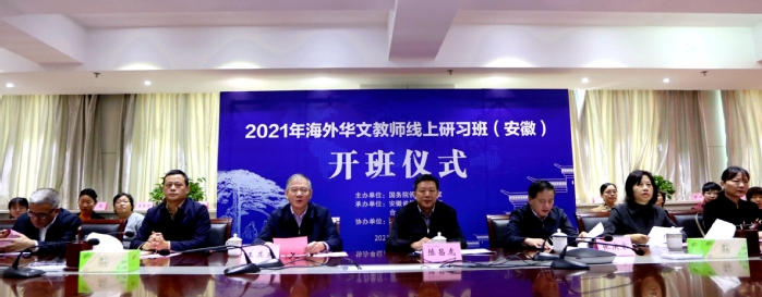 10月25日,由国务院侨办主办、安徽省侨办和合肥学院共同承办、菲律宾华教中心协办的2021年海外华文教师线上研习班(安徽)在合肥学院开班,120名来自菲律宾华教中心、泰国侨南学校、缅甸国际教育中心的华文教师打破时空阻隔,在云端相聚。安徽省委统战部常务副部长陈昌虎,安徽省教育厅副厅长张庚家,中国新闻社安徽分社社长吴卫中,合肥学院党委书记王其东、校长吴春梅出席。省委统战部、省教育厅相关处室负责人,合肥学院相关职能部门负责人及教师代表参加开班仪式。开班仪式由吴春梅主持。