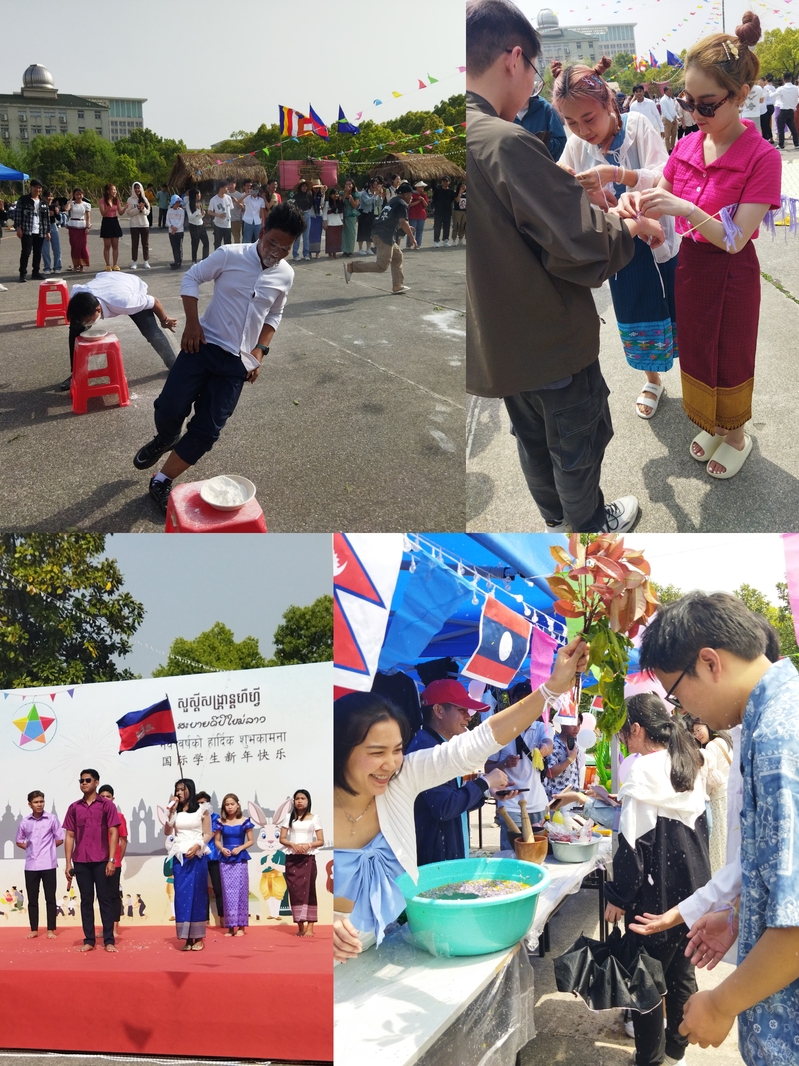 下午的文艺汇演首先是歌舞节目,各国同学载歌载舞,在富有民族特色的歌舞节目中,展现了多元文化和各国文明交流互鉴、共同融合发展的和谐面貌。随后活动进入互动环节,柬埔寨传统游戏“抢树枝”、“面粉挑糖果”,各国同学积极参与,共享欢乐时光。最后,迎来了新年庆祝活动的高潮——泼水环节。泼水既表达对彼此的美好期望,也寄托着对来年的祝福。活动中的一声声“新年快乐”在此刻显得格外真挚。熬过寒冬,我们盛情拥抱生机盎然的新春。疫情期间,大家一起共克时艰,才迎来今天的团聚时刻。