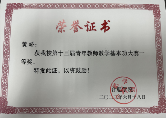 为深入贯彻落实学校本科教育质量提升工程,进一步提升本部门师德师风建设和广大青年教师强化立德树人能力,夯实教学基本功,强化教师教学业务能力与水平;体艺部严格按照学校要求精心组织本部门参加校第十三届青年教师教学基本功大赛。6月15日,在部门初赛的基础上推选黄峤老师代表体艺部参加校级决赛,最终经过激烈角逐,我部黄峤老师荣获文科组一等奖,体艺部荣获优秀组织奖。