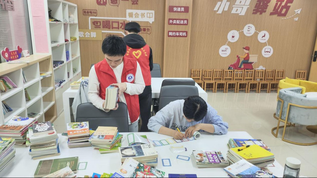 首先志愿者们在朝霞社区楼下进行集合签到,在朝霞社区工作人员的指引下对新购置的图书进行贴书签并整理。志愿者们给每本图书贴上书签,书签内容包括图书类别和编号等关键信息。同时,他们将图书按类别整齐摆放在书架上,细心地把儿童读物放低层、成人书籍按类型放高层合适位置,使图书管理更有序,为居民借阅提供便利。