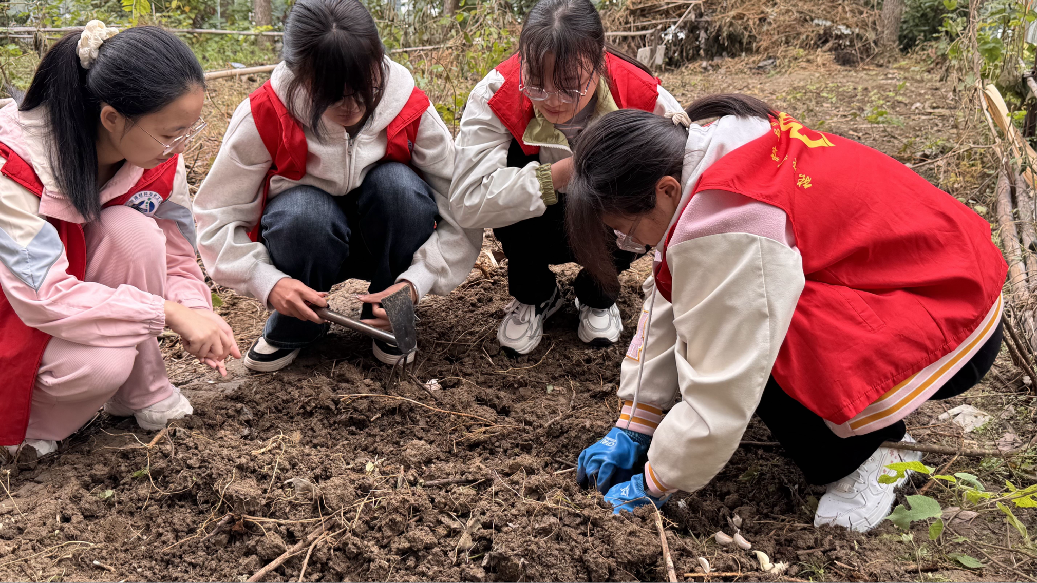 活动现场,六名学生分成个小组,有的负责准备土壤,有的负责挑选优质的大蒜种子,有的则专注于学习如何正确种植。在往期23级学长马争鸣的帮助下,他们很快掌握了种植的技巧,小心翼翼地将大蒜瓣埋入土中,期待它们不久后破土而出,长出嫩绿的蒜苗。