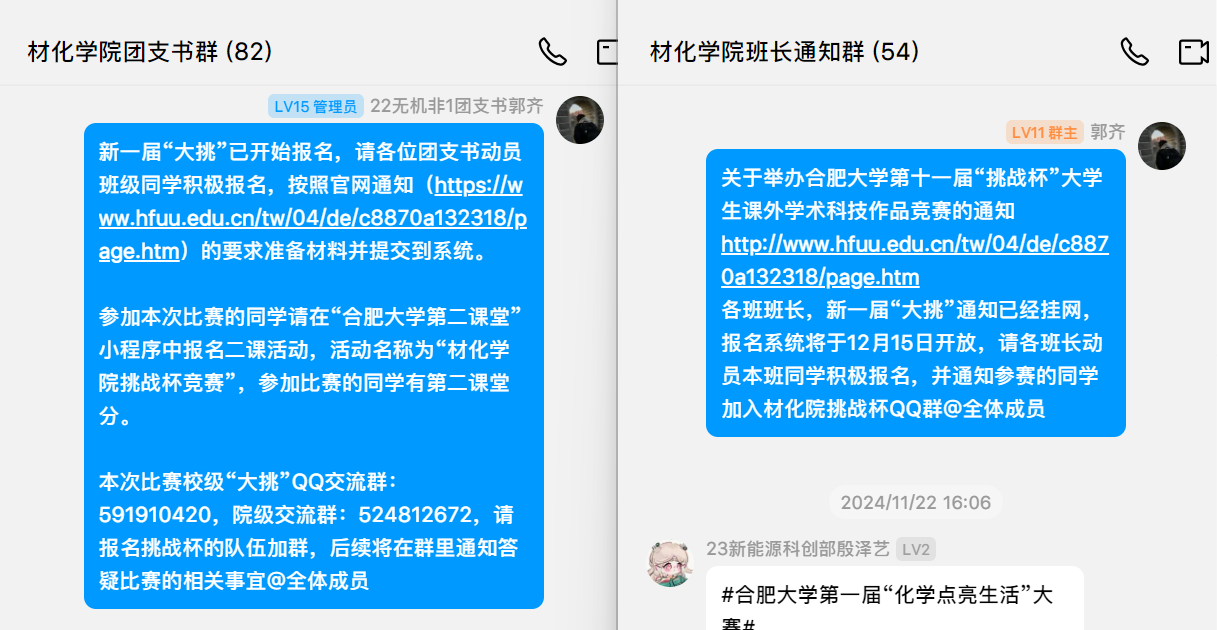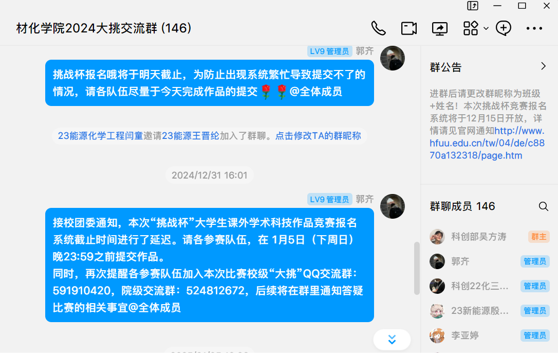 本次报名采用网上报名的方式,由各个队伍项目负责人在系统中注册账号、提交项目完成报名,十分高效。为了方便各负责人登录系统,科创部及时对账号注册申请进行了审批。同时,科创部还建立了本次“大挑”竞赛的材化院分群,以便于下发后续有关本次竞赛的通知。