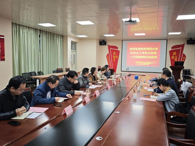 能源材料与化工学院院长杨伟主持会议,学院党委书记黄雄英致欢迎辞。座谈会上,我院重点介绍了院系设置、专业建设、学科布局、科研平台建设及近年来在教学改革、科研成果转化等方面的工作成效。王钧伟院长也介绍了安庆师范大学化学化工学院的专业建设、院系结构等情况。会后,双方均表示此次交流活动内容充实、收获颇丰,不仅增进了两校化学化工学院之间的了解与友谊,也为今后在专业建设、人才培养、科研合作等方面搭建了良好的沟通平台。(撰稿人:姚李;初审:郝玉成;复审:胡恩柱;终审:杨伟)