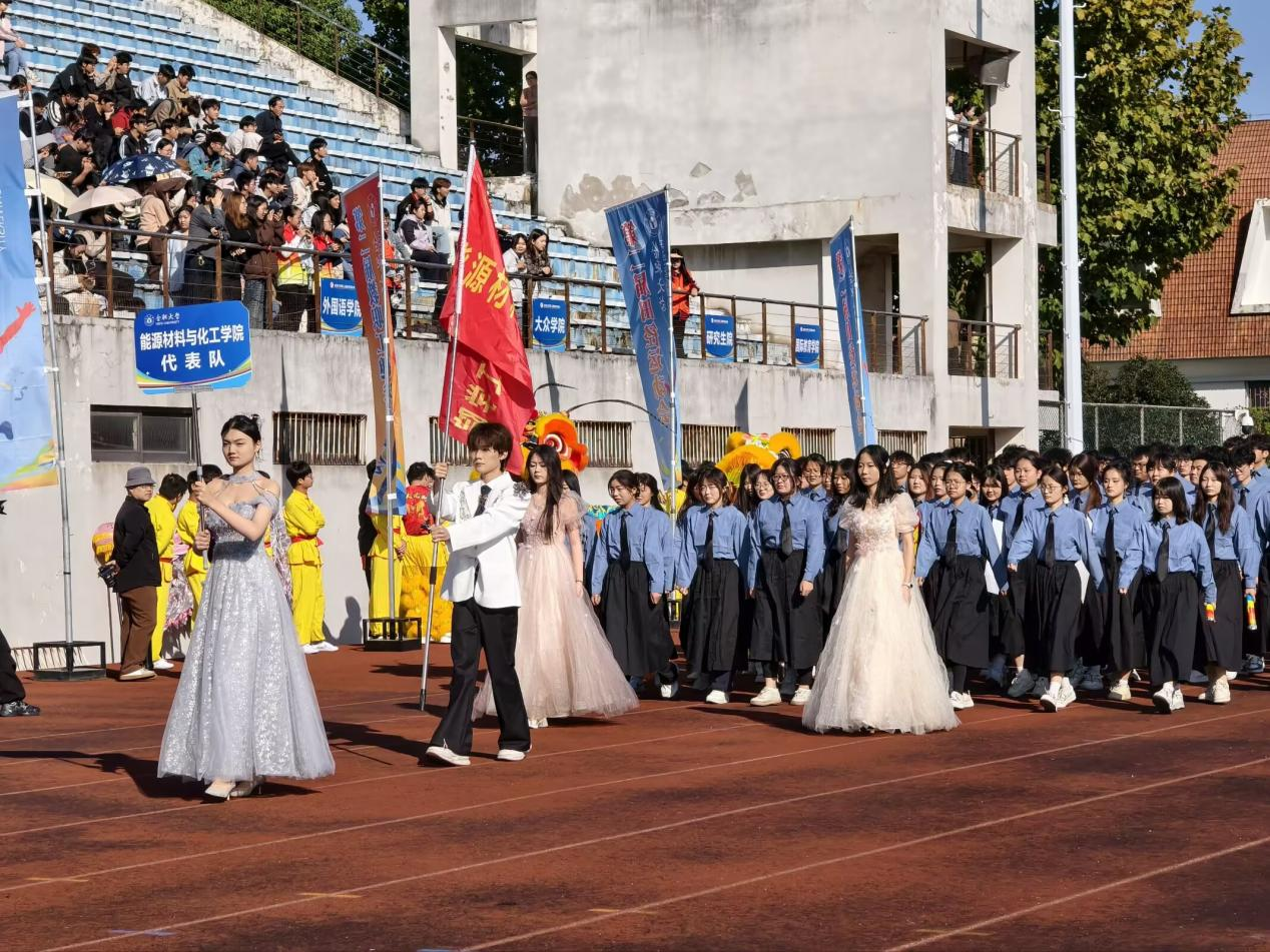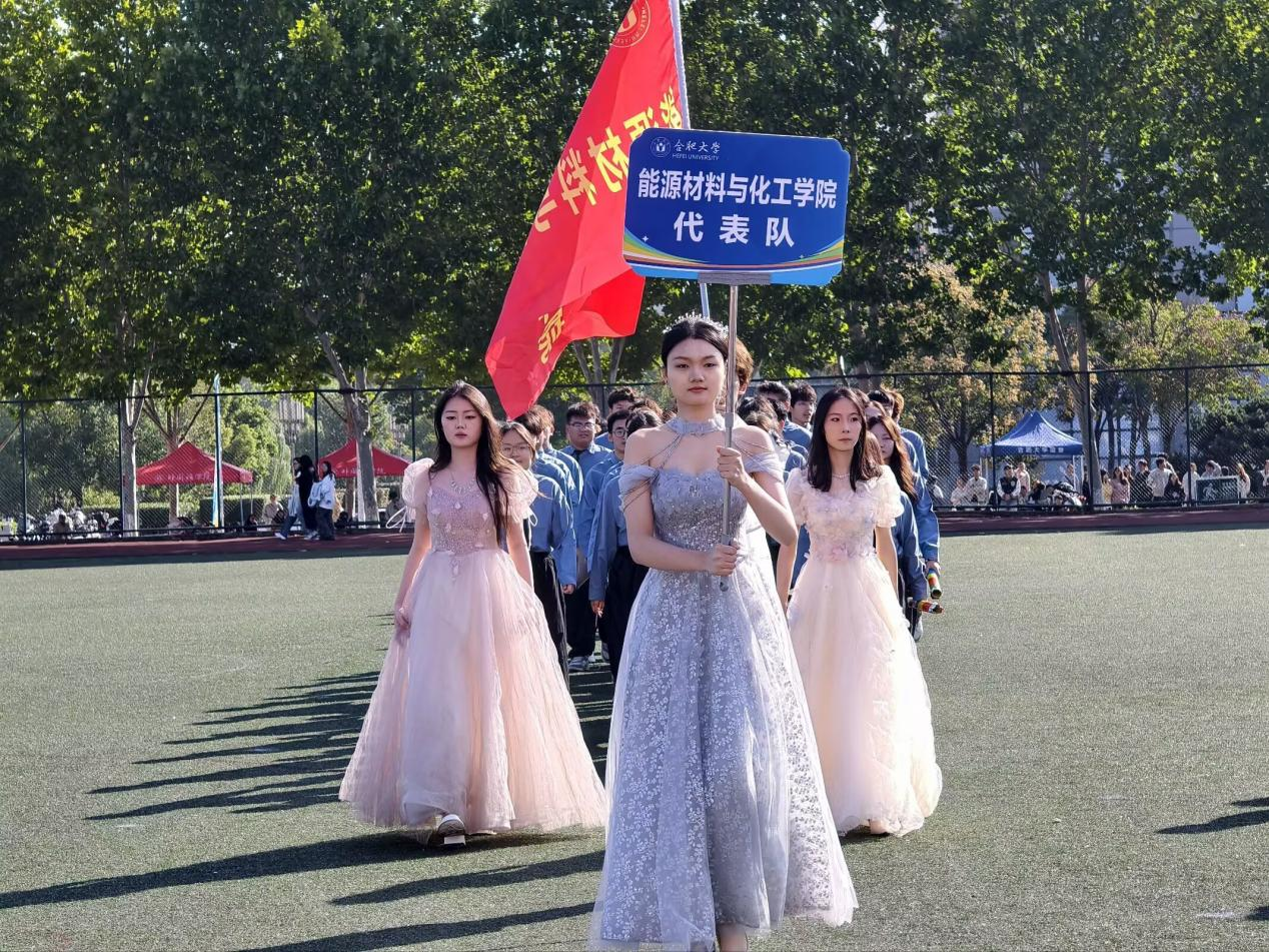 运动会伊始,备受瞩目的开幕式准时启幕。主席台上彩旗飘扬,台下各学院师生精神抖擞,共同迎接这场属于青春的盛会。此刻,能化学院的方阵成为全场焦点——为了以最佳状态亮相,方阵的同学们已连续多日在夜晚的训练场刻苦集训,汗水浸湿衣衫,脚步反复打磨,只为在这一刻展现学院的风采。伴随着激昂雄壮的音乐,方阵队员们迈着铿锵有力的步伐,身姿挺拔,步伐整齐划一,如同一支训练有素的队伍,目光坚定,表情严肃而庄重,一步步向主席台走来。当行至主席台前,同学们精神抖擞地完成队列变换,以昂扬的姿态定格,随后齐声喊出“能聚匠心,材创卓越,化谱新篇”的响亮口号。那声音洪亮激昂,回荡在整个运动场,既彰显了能化学子精益求精的匠心精神,也传递出锐意进取的青春豪情,赢得了主席台上领导与台下师生的阵阵热烈掌声,掌声里满是认可与赞许。