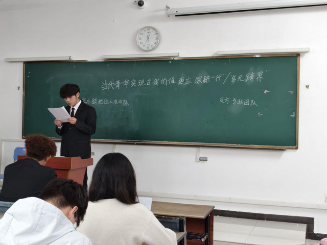 攻辩与自由辩论环节,整场比赛的热度被推向顶峰。正方紧扣“深耕的专注力与成果沉淀”,犀利发问:“若一味追逐跨界广度,是否会陷入‘样样通却样样松’的困境?”反方则以“跨界绝非浅尝辄止,而是基于专业基础的融合拓展”巧妙回应,并列举青年创业者整合多学科资源、打造创新项目的鲜活案例,进一步论证:“专注与跨界并非对立,而是相辅相成。”双方辩手反应迅捷如电,逻辑链条环环相扣,时而引用权威数据增强论证力度,时而结合青年成长日常引发情感共鸣,每一次精彩交锋都引来现场师生的热烈喝彩,掌声此起彼伏。