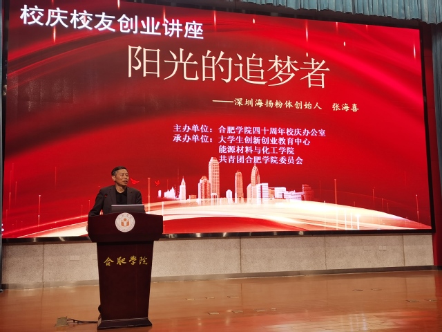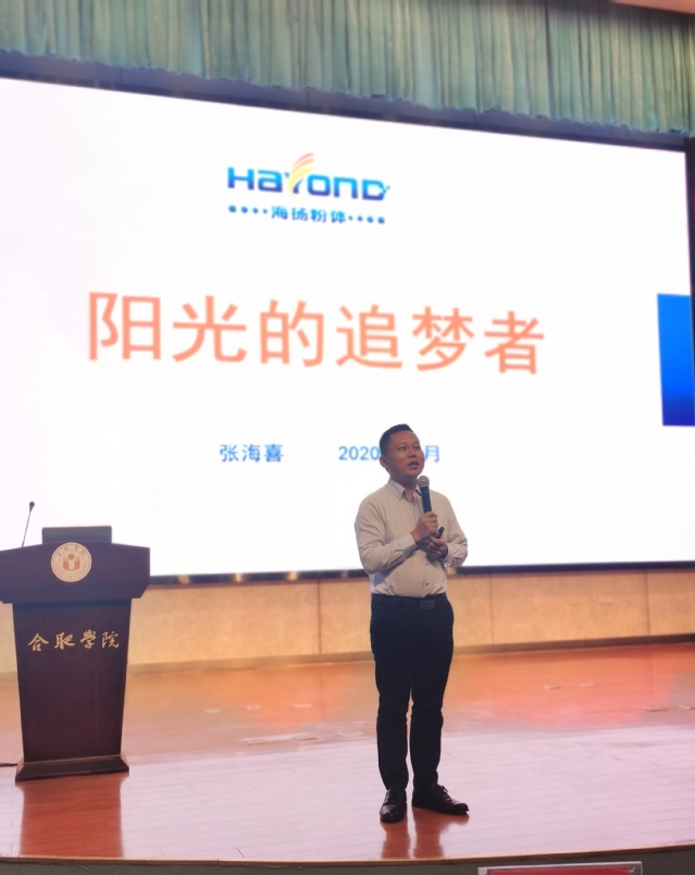 童玉松在开场致辞中代表学校欢迎优秀校友张海喜返校,他指出,成功者的路,都是在感天动地的努力中,用汗水、智慧和坚毅辅就的。接下来,作为深圳海扬粉体科技有限公司创始人张海喜分享了毕业十余年创业历程。他谈到其中的每个时间段都是成功路上的里程碑,记录着他的青春奋斗史。而这些例子也激励着学生们去勇敢追梦。不仅如此,他还向同学们讲述自己艰难徒步沙漠,爬雪山最终抵达终点的经历,并对此抒发的自己的感想。他指出,创业的过程并不是一帆风顺,多年以来积累的资产曾因一场台风损失惨重,面对这次沉重的打击,他并没有选择放弃,而是继续寻找出路,最终以凤凰涅槃的姿态迎来公司更好的发展。最后,张海喜表达了自己对新一代创业者的鼓励和期望。