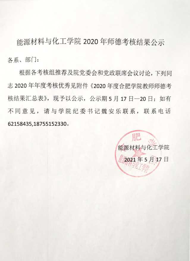 能源材料与化工学院2020年师德考核结果公示