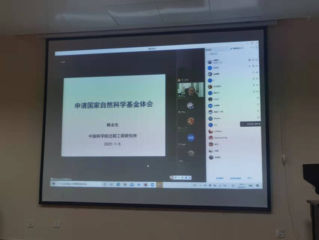1月5午,受材化学院董强院长邀请,中科院过程所韩永生研究员材化学院学术报告会议室做了“申请国家自然科学基金体会线上辅导报告会,材化学院邓崇海副院长主持会议韩研究员结合自身在科研过程中基金项目申请的切身体会,系统地分享了他在自然科学基金项目书中每一个环节的思考和心得,并从评审专家评价项目书的角度如何提升项目书质量、如何凝练关键科学问题提供了意见和建议。韩老师总结了“以科学问题为主线、以研究假说为先导,紧紧围绕科学问题和研究假说写申请书的题目、摘要、立项依据、研究内容与研究方案以及自己的研究基础”的总体基金写作思路。随后,青年老师就基金申请方面的一些问题跟韩老师做了进一步的交流与讨论,最后,材化学院董强院长做了总结。