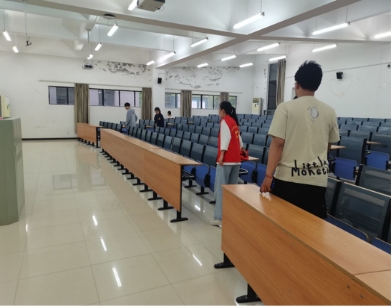 “共创文明校园,营造温馨食堂”活动中,我院志愿者一丝不苟地整理、清洁生化楼教室,擦拭黑板、摆放桌椅、打扫地面……不落下任何一个角落,为同学们营造学习环境。