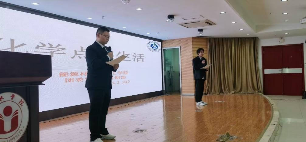 11月20日晚七点整,由能源材料化工学院院学生会科创部主办,院学生会各部门协办的“化学点亮生活”大赛决赛在大学生活动中心报告厅拉开幕。本次比赛由能源材料与化工学院主席团成员王振鑫、彭泽宇、魏嘉琪、朱海涛、张小辉担任评委