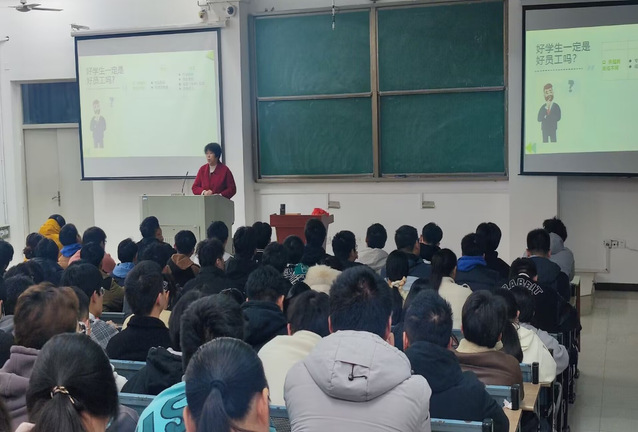 宋美主任围绕如何定义好学生和好员工、企业甄选人才标准两个方面向学生展开宣讲。她强调:一个人的才能体现在个人的能力方面,即真才实学,合作能力,沟通能力等。真才实学就是指个人的基础知识与技能,以及职业知识与技能。学习能力等于成长力,学习是最小最长久的投资,要利用碎片化时间去学习,做时间的主人。一步一步,从能人到强人、高人最后到真人,随后就如何提升职业竞争力、如何进行职业规划等方面进行了深入的探讨,为在座学生提供了宝贵的指导意见。