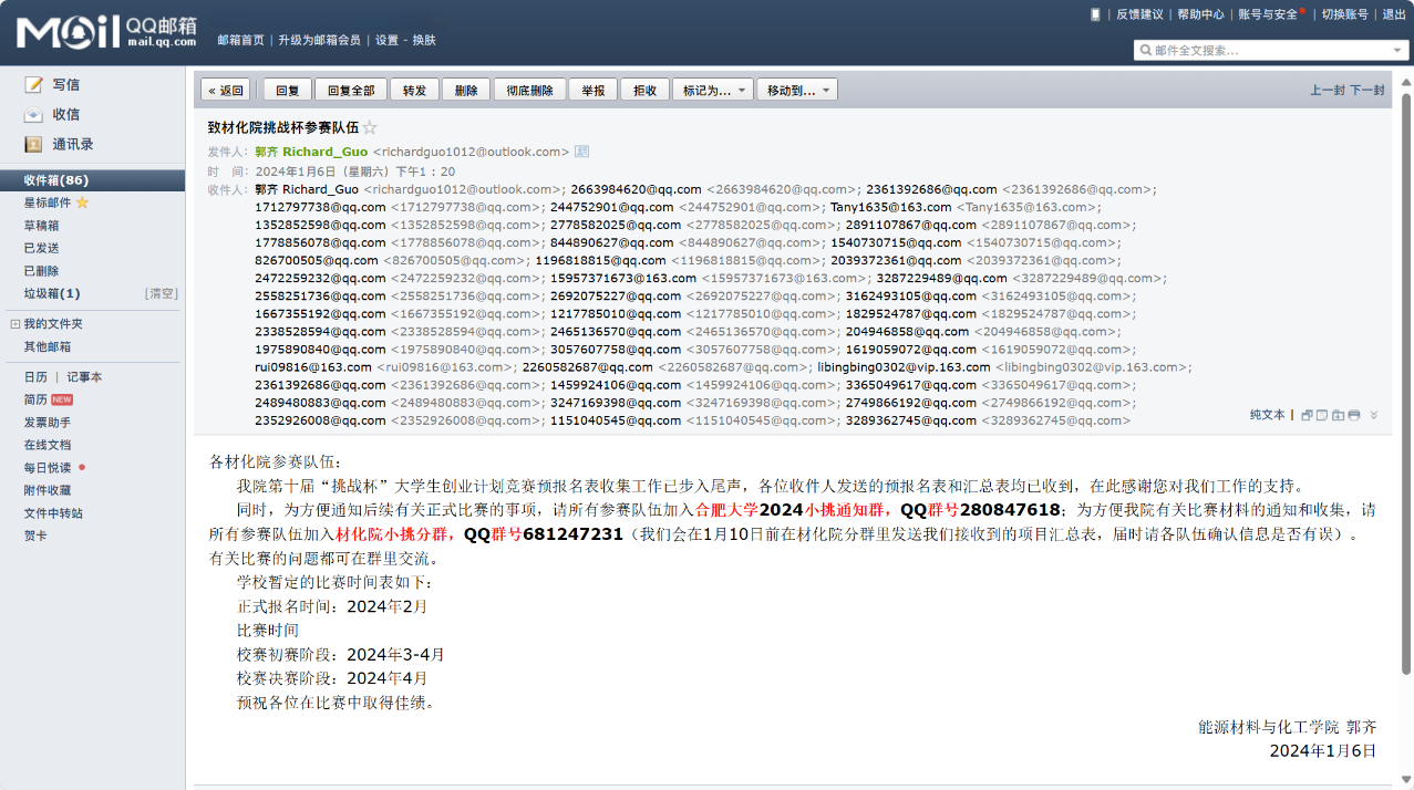 在预报名阶段,由项目负责人填写项目报名表,并发送至科创部负责人邮箱,再由科创部负责人归纳、整理好所有报名项目,填写项目汇总表,并及时报送至校科技部,完成预报名表的收集工作。整个过程十分高效,工作质量较高。此外,学院还建立了材化学院小挑分群,便于下发后续有关挑战杯的通知。