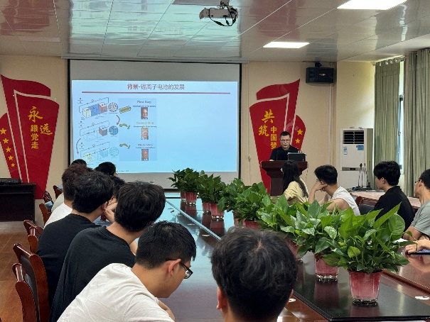 朱教授首先从介绍锂离子的研究背景开始,高电压锰基锂离子电池因其潜在的高能量密度和低成本,成为当前研究的热点之一,激发了同学们的研究兴趣。而后详细论述了通过优化电解液和正极材料,可以显著提升电池的工作电压和能量密度,尤其是锰基材料,因其丰富的资源、低廉的成本和优异的电化学性能,被认为是下一代高性能锂离子电池的理想选择。他强调高电压镍锰酸锂在充放电过程中会经历复杂的物相转化,其结构动态对电池性能至关重要。同时,在全电池设计方面,研究人员开发了多种新型LNMO全电池器件,通过优化电解液配方和电极结构,实现了高能量密度和高安全性。最后,朱教授对报告进行了总结,本院师生和朱教授进行了互动交流,报告在全体师生的掌声中落下为帷幕。