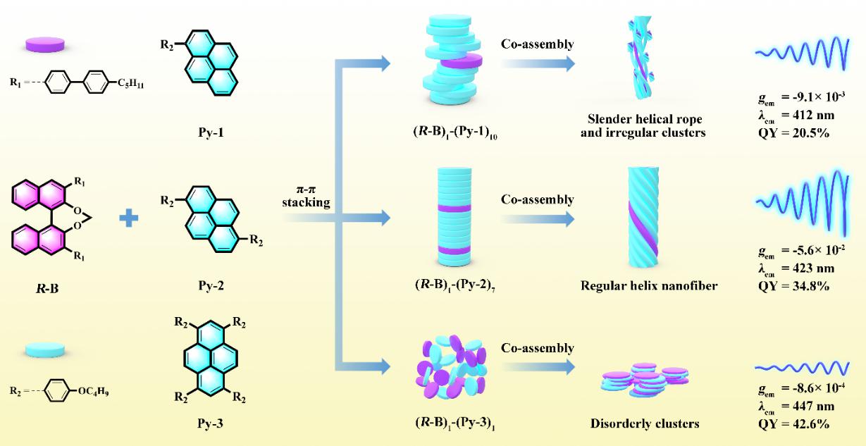 CPL材料的发光行为(例如,发射波长,量子产量以及glum)调控对其实际应用具有重要意义。迄今为止,针对手性芘基自组装或共组装的CPL发射行为的调控策略主要集中于调节手性诱导剂结构、分子内或分子间相互作用、溶剂效应等因素,而在手性共组装体系中,通过改变非手性芘基发射体的结构对称性来调节CPL发射行为的报道还很少。研究人员精心设计了3种具有不同丁氧基苯取代基数目的非手性芘基有机小分子 (Py-1、Py-2Py-3)和锚定二面角的手性二苯基诱导剂(R/S-B)构建手性共组装体,并探讨了它们诱导的CPL行为。研究发现,制备的手性共组装体具有多层级CPL发射行为。结构分析和分子动力学模拟表明,(R/S-B)1-(Py-1)10、(R/S-B)1-(Py-2)7和(R/S-B)1-(Py-3)1的多层级CPL发射行为可归因于非手性芘基发射体的结构对称效应导致的不同共组装模式。其中,(R/S-B)1-(Py-2)7的最强CPL发射(|gem| = 5.6×10-2,λem = 423 nm, QY = 34.8%)源于分子间π-π堆叠相互作用驱动下以层状堆积模式形成的高度有序的螺旋状纳米纤维。该研究为通过调控手性共组装体系中非手性芘基发射体的结构对称效应来调CPL的发射行为提供了新的策略。该工作近期在化学学科知名学术期刊Journal of Colloid and Interface Science发表(doi.org/10.1016/j.jcis.2024.05.019)。