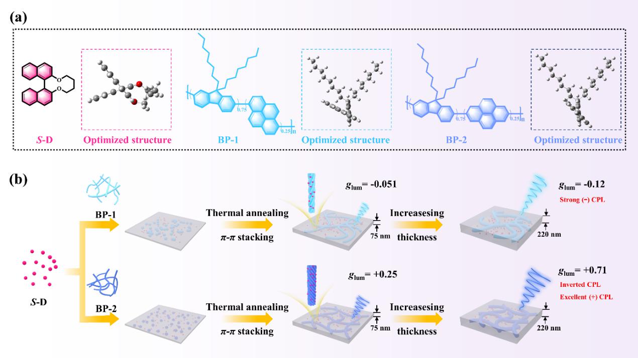 圆偏振发光(CPL)材料在三维成像、光学信息存储、不对称合成等方面颇具应用潜力,在手性科学研究中具有重要意义。手性组分在氢键、静电相互作用及π-π堆积等相互作用的协同下,可以组装成各种各样的手性结构,表现出独特的CPL性质。目前大多数CPL材料的不对称因子(glum)值低于10-2数量级,如何提高glum值以及如何实现手性转移、传递和放大成为当前CPL研究亟需解决的最关键科学问题之一。为解决这一难题,近日,日韩欧美福利视频_黑人巨大人精品欧美三区_欧美成人另类人妖_欧美在线精品一区二区三区_欧美一区二区三区性视频_日韩精品欧美视频_性欧美极品xxxx欧美一区二区能源材料与化工学院青年教师耿中兴及其合作者在高glumCPL材料的构筑和性能提升研究方面取得了系列新进展。研究人员创新性地采用两种不同取代位点的非手性芘基主链聚合物(BP-1BP-2) (BP-1的芘环为1,6位,BP-2的芘环为2,7)作为CPL发射体与一种带有桥接烷基链的手性联萘诱导剂(S/R-D),通过分子间手性诱导机制构建螺旋手性共组装体。有趣的是,与S/R-D-BP-1相比,经过热退火处理的手性共组装体S/R-D-BP-2可以发出反转和放大的CPL信号。最佳质量掺杂比的手性共组装体(S/R-D)0.2-(BP-2)0.8旋涂薄膜的最大|glum|值在220 nm厚度下高达0.71 (λem = 428 nm, QY = 44.8%),约为(S/R-D)0.1-(BP-1)0.9(|glum| = 0.12,λem = 451 nm, QY = 37.6%)6倍。值得强调的是,在分子间π-π堆叠相互作用驱动的手性共组装芘基CPL材料中,最大|glum|值高达0.71是迄今为止报道的最高值之一。实验和理论分析结果表明反转CPL信号可归因于手性共组装过程中分子间π-π堆叠相互作用驱动的不同共组装模式导致螺旋纳米纤维方向相反。本研究为基于非手性芘基主链聚合物结构-活性调节手性共组装发射体的CPL发射行为提供了一种有效的新方法。该工作近期在高分子学科权威性学术期刊Macromolecules发表(doi.org/10.1021/acs.macromol.4c00153)。