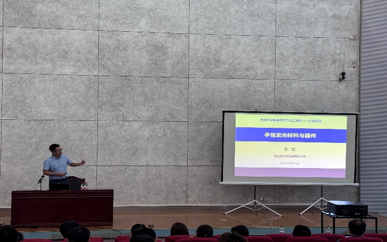为促进研究生对手性材料前沿领域的认识,提升科学素养,9月24日上午10点,中国科学院化学研究所员李猛博士应耿中兴博士邀请为我院师生作了以“手性发光材料与器件”为主题的学术报告。本次会议由院长胡坤宏教授主持,副院长邓崇海教授及学院师生参加了学术会议。