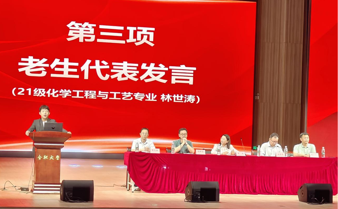 随后,老生代表2021级化学工程与工艺专业林世涛分享了在学校的学习和生活经验。鼓励新生积极适应新环境,尽快融入大学生活。他强调合理规划时间,平衡学习、娱乐和社团活动,养成良好的学习习惯,并制定明确的学习目标。同时,他还提醒新生珍惜友谊,互相学习与帮助,同时注重综合素质培养,积极参加实践活动,提升实践和创新能力,为未来发展打下基础。
