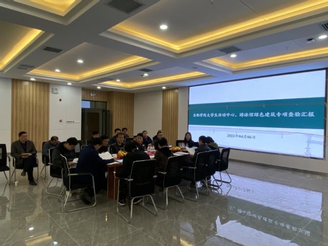 202346日下午于大学生活动中心一楼西侧会议室进行合肥学院大学生活动中心、游泳馆项目绿色建筑验收专项会议,会议由建设单位合肥学院建管处组织,代建单位合肥市重点局、建设、设计、施工单位责任主体按要求到场,查验组听取了建设单位的绿建汇报,并结合工程现场和绿建设计情况,赴现场进行了踏勘和图纸查阅。