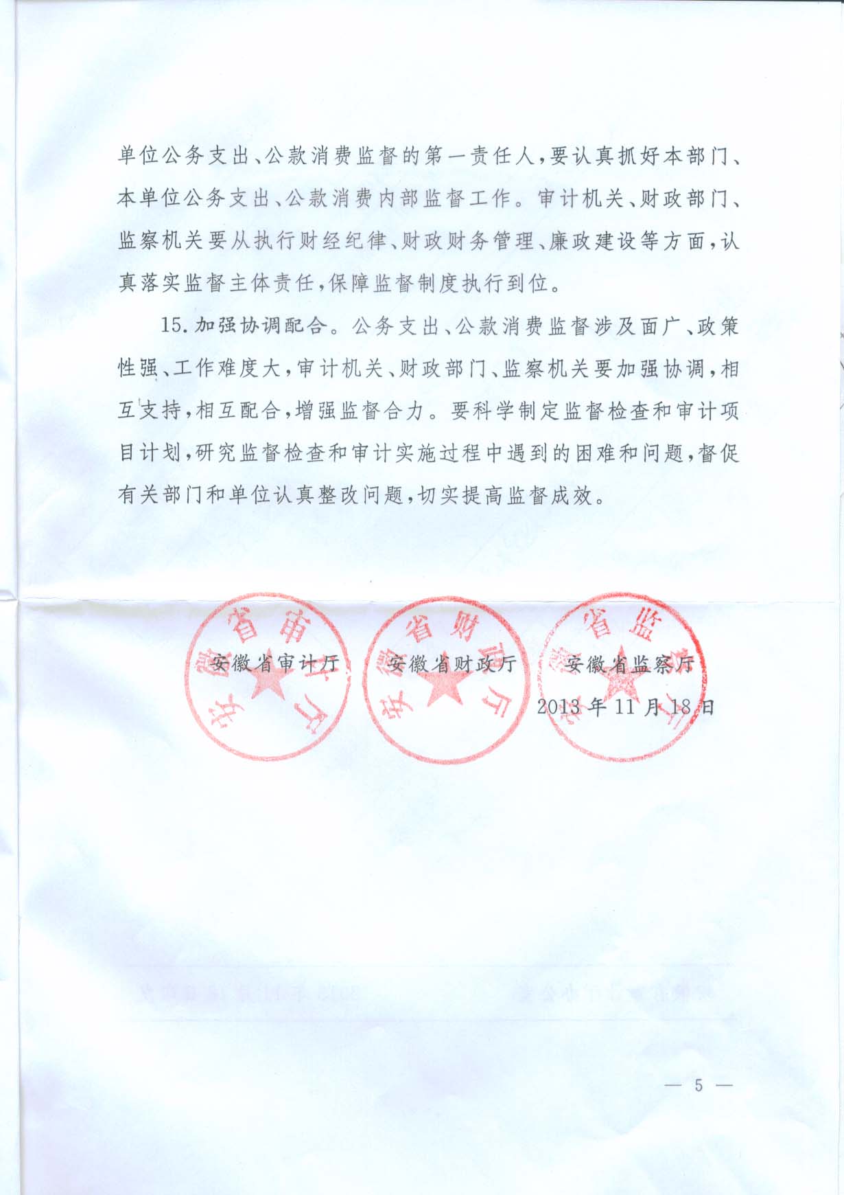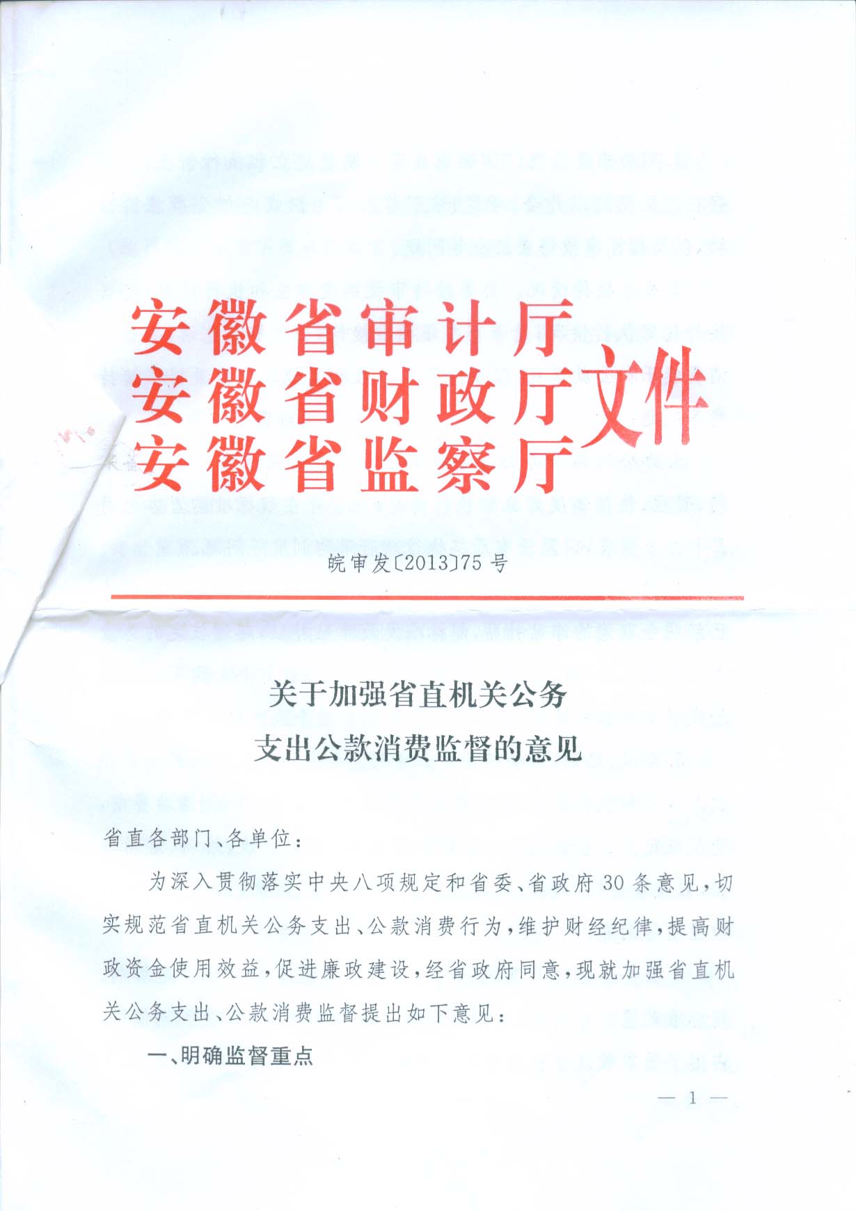 关于加强省直机关公务支出公款消费监督的意见(皖审发【2013】75号)