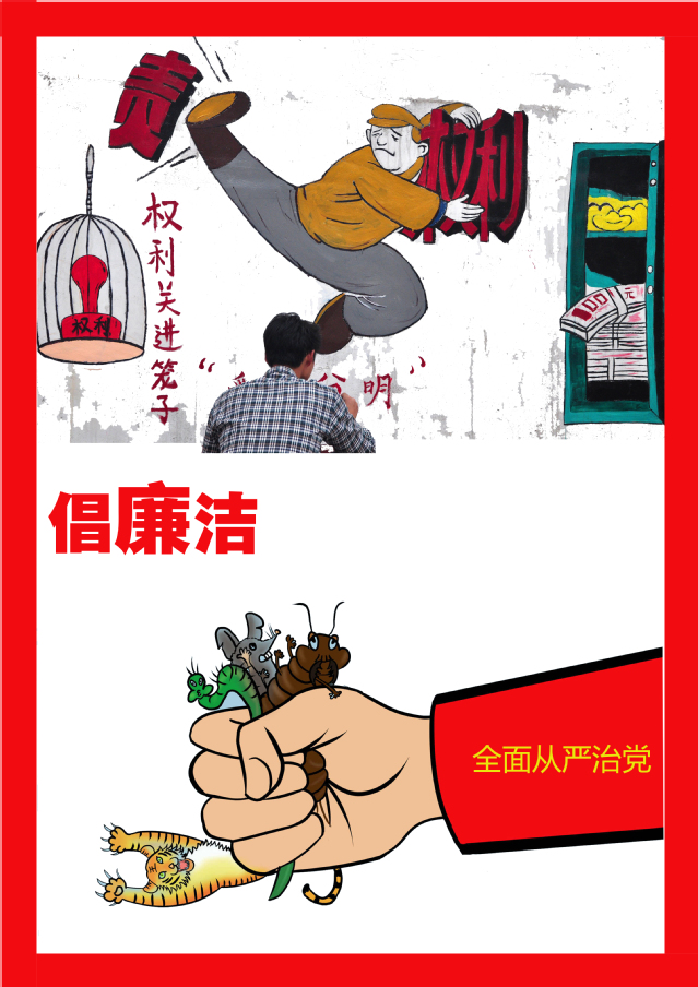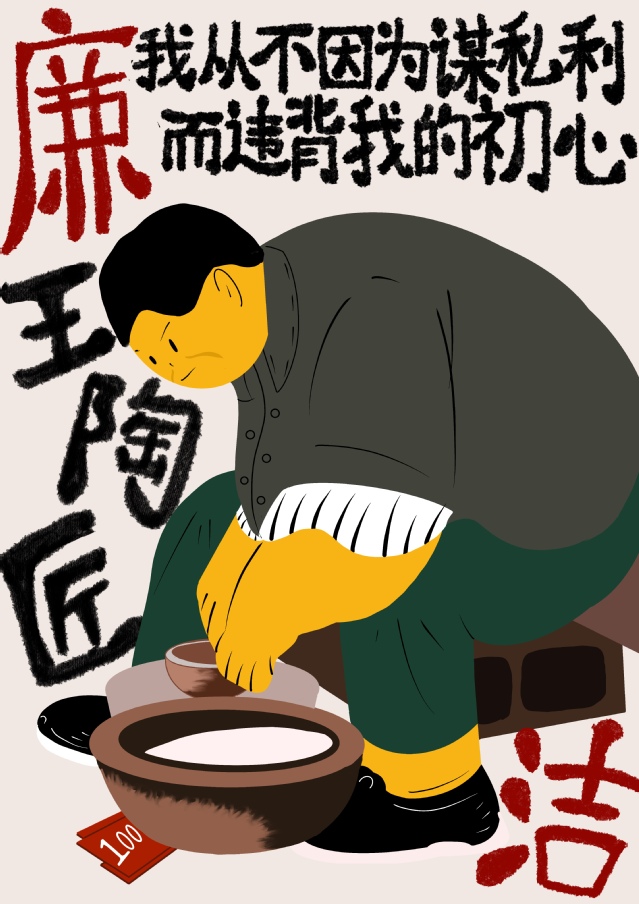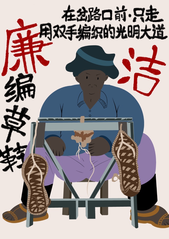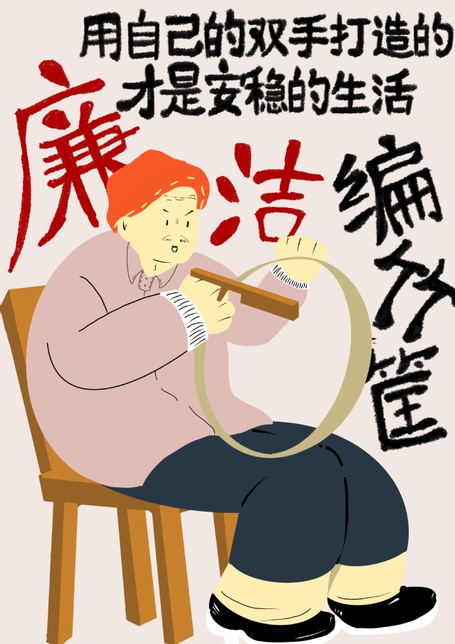 作品围绕“反腐廉洁”进行创作,运用了三位手工艺人的形象对贪污腐败的人进行反讽;将腐败不正之风的人不会有的生活方式直接写了出来,同时使用扁平画的风格将生活中最朴素人物的真实的状态表现出来,字体偏手写风格,充满亲和力,“廉洁”两字使用红色更加突出。