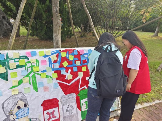 世界精神卫生日是每年10月10日,精神卫生是指一种健康状态,在这种状态中,每个人都能够认识到自身潜力,能够适应正常的生活压力,有效地工作,为其居住的社区做出贡献。本次活动主要分为制作心情颜色画板、心理趣味小知识便条、心情盲盒、撕掉心情标签、心情分享和给未来自己的一封信六个部分。活动初期,志愿者主要开展制作心情画板和分发心理小知识便条两个活动,用绿色、黄色、红色和蓝色分别代表开心、无聊、生气和忧郁的心情,让同学们按照当天的心情选择画笔的颜色随意画在画板上完成画作《我的心情日志》,并准备心理趣味小知识便条,让更多同学了解心理知识。活动的第二天,志愿者们积极鼓励同学同学们在便签上写下自己的烦心事,贴在展板上,随后在心情盲盒中抽取一张带有鼓励或正能量的话语便签投入盲盒中,让温暖传递。活动后期,志愿者与同学们一起谈心,聊聊自己遇到的难题,帮助同学们一起解决问题。在活动的最后,同学们起笔写下给未来自己的一封信。