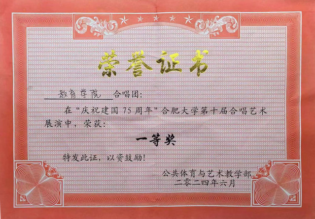 此次获得一等奖不仅是对教育学院合唱团成员们辛勤付出的肯定,也是对他们音乐才华和团队协作精神的赞誉。教育学院将继续支持合唱团的发展,为他们提供更多的资源和平台,让他们在音乐的道路上越走越远,创造更多的辉煌。(教育学院撰稿:罗鑫、彭锦 初审:曹红星 复审:王迅 终审:刘良宏) |