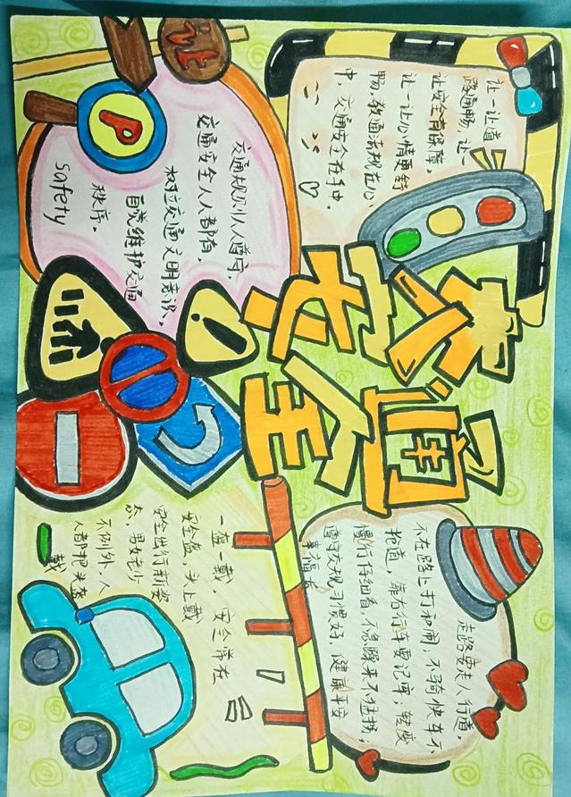 此次活动吸引了学生的积极参与,他们利用课余时间搜集资料,精心设计手抄报内容。同学们的作品不仅版面设计精美,而且主题多样,涵盖了交通信号识别、安全行走规则、骑行和乘车安全等多个方面,充分展示了学生们对交通安全重要性的认识和理解。活动参与者用手中的笔绘出生动的图画、写下有力的文字,呼吁大家学习交通法规,并将其应用到日常生活中,共同营造一个安全、和谐的校园环境。