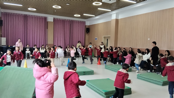 学生们入园后,实地观摩了大二班儿童的体育活动课程,课堂以“接火车热身—变身老鼠钻山洞—变成山洞抓老鼠”为教学主线,通过“情景体验式”教学方法激发孩子们的运动兴趣。在“变身老鼠钻山洞”环节,学生搭建山洞,体验了和孩子们的亲密互动,在互动教学中丰富了实践经验。