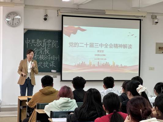 为了帮助我院学生入党积极分子深入理解党的最新政策方针,坚定其理想信念,为早日成为合格的共产党员打下坚实基础,教育学院分党校于2024年11月12日中午12:30,在三栋301教室,开展了一场别开生面的入党积极分子培训课。此次培训特别增设了党的二十届三中全会精神解读专题,并邀请马克思主义学院黄莹莹老师进行授课。 培训伊始,黄莹莹老师以饱满的热情和专业的知识,向入党积极分子们详细阐述了党的二十届三中全会的重大意义、核心内容和深远影响。她强调,党的二十届三中全会是在我国全面建设社会主义现代化国家的关键时期召开的一次十分重要的会议,会议通过的《中共中央关于进一步全面深化改革、推进中国式现代化的决定》是指导新征程上进一步全面深化改革的纲领性文件。