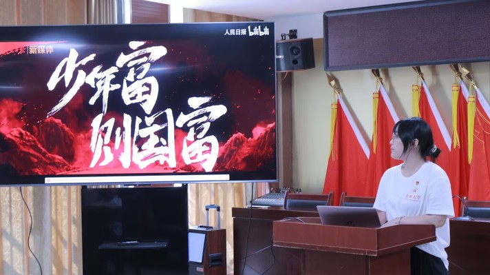 课程伊始,周友梦蝶以梁启超先生的《少年中国说》为引,将诗词内容逐句呈现于黑板之上。她从字词发音的精准把控,到语义内涵的细致解读,将诗词中的精髓娓娓道来。在团队成员声情并茂讲述的历史故事映衬下,“少年智则国智,少年富则国富”等饱含殷切期望的词句,宛如灵动的音符,奏响了中华文明传承的铿锵乐章,更似星火燎原的火种,悄然播撒于少年心田。 教唱环节,团队成员化身耐心的引路人,逐句示范每一个音准、节奏,细致教授情感的表达和手势配合的技巧。孩子们全神贯注,紧跟节奏,专注地模仿练习。遇到难唱的部分,他们没有丝毫退缩,在教师鼓励的目光和话语中,一次次反复尝试。渐渐地,整齐动听的歌声在教室里悠悠回荡,每一个音符都跳跃着青春的活力。教室里,稚嫩而坚定的童声与激昂的乐声交织在一起,展现出新时代少年如朝阳般的蓬勃朝气。