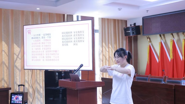 团队成员周友梦蝶以“以手传情,礼赞祖国”为主题展开教学,用国庆节的由来作为切入点,向学生们讲述新中国成立的光辉历程和伟大成就。周友梦蝶在教学中强调:爱国主义是中华民族的精神基因,是维系民族团结、推动国家发展的重要力量。她指出,学习《国家》手势语不仅是对语言的传承,更是对爱国精神的弘扬。